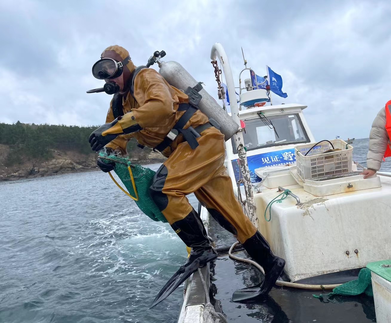 隨著一聲聲鏗鏘有力的長海號子響起,30余艘漁船在海天之間前行,奔赴獐子島馬牙灘海域。馬牙灘位于獐子島西北側(cè)海域,是大連地區(qū)少有的純種野生海參棲息地。潛水員們憑借嫻熟的技術(shù),頃刻間就躍入海浪之中,大約十分鐘之后,就帶著滿滿的一袋新鮮野生海參浮出海面。船上的工作人員第一時間對海參進(jìn)行現(xiàn)場分揀,并記錄采捕時間、海域、船號、潛水員、海參個數(shù)等信息,為原產(chǎn)地溯源提供依據(jù)。
