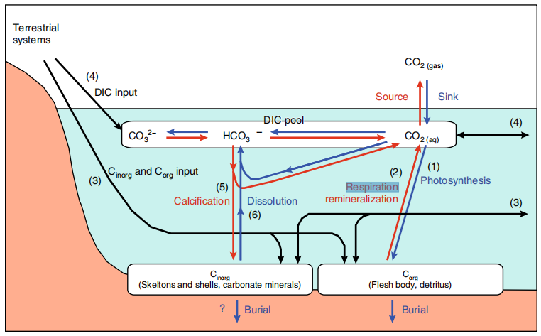 圖1 空氣-水-CO2交互的碳生物地球化學過程概念圖。藍線表示大氣CO2吸收的過程,紅線表示CO2排放到大氣中的過程。地表水中的CO2濃度主要決定通量的方向。地表水CO2濃度由溶解無機碳(DIC)中的碳酸鹽平衡決定,并受生態(tài)系統(tǒng)凈生產(光合作用、呼吸和再礦化的平衡)影響,直接調節(jié)DIC、外來顆粒物和溶解有機碳(Corg)、顆粒無機碳(Cinorg)以及來自陸地系統(tǒng)和沿海海洋的DIC輸入、凈Cinorg生產(鈣化和溶解的平衡),直接調節(jié) DIC 和總堿度(TA)和溫度(CO2溶解度)。鈣化作用產生的 CO2在正常海水中的比例(釋放的CO2/沉淀的 Cinorg)約為 0.6 。
