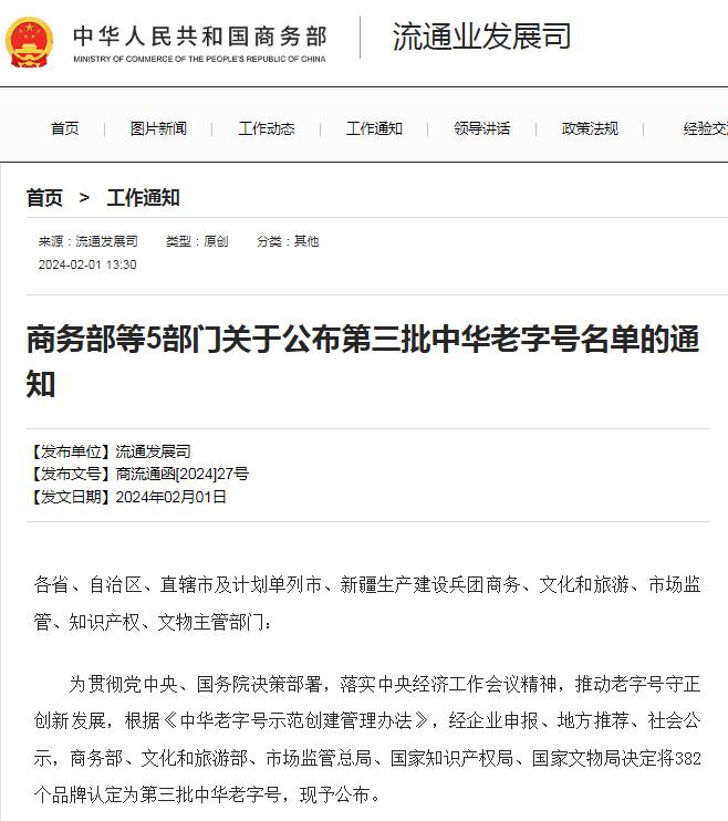 為貫徹黨中央、國務(wù)院決策部署,落實(shí)中央經(jīng)濟(jì)工作會(huì)議精神,推動(dòng)老字號(hào)守正創(chuàng)新發(fā)展,根據(jù)《中華老字號(hào)示范創(chuàng)建管理辦法》,經(jīng)企業(yè)申報(bào)、地方推薦、社會(huì)公示,商務(wù)部、文化和旅游部、市場監(jiān)管總局、國家知識(shí)產(chǎn)權(quán)局、國家文物局決定將382個(gè)品牌認(rèn)定為第三批中華老字號(hào)。