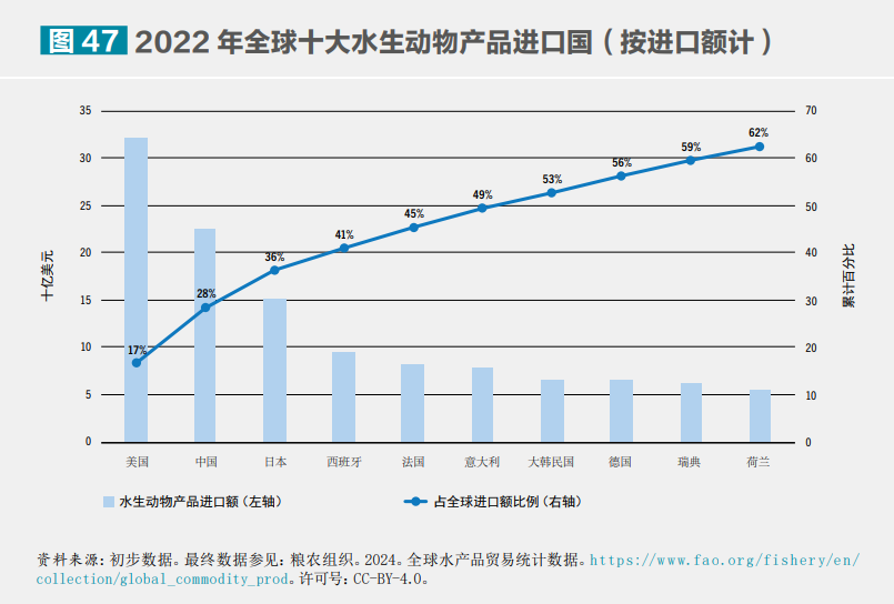 2022 年全球十大水生動物產(chǎn)品進口國(按進口額計)。?糧農(nóng)組織