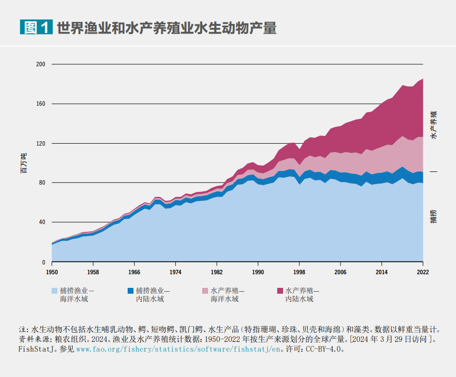 1950-2022年世界漁業(yè)和水產(chǎn)養(yǎng)殖業(yè)水生動物產(chǎn)量變化圖。?糧農(nóng)組織