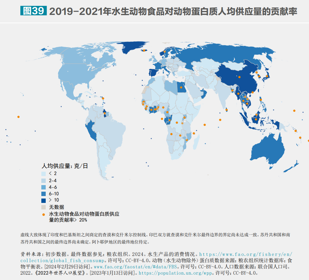 2019-2021年水生動物食品對動物蛋白質(zhì)人均供應量的貢獻率。?糧農(nóng)組織