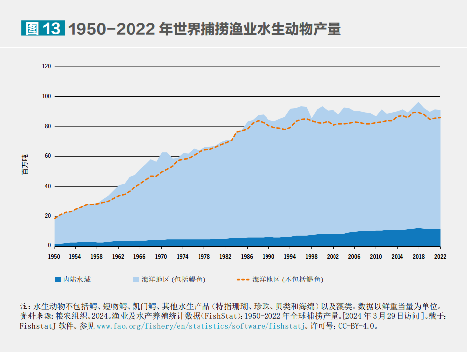 1950-2022 年世界捕撈漁業(yè)水生動物產(chǎn)量。?糧農(nóng)組織