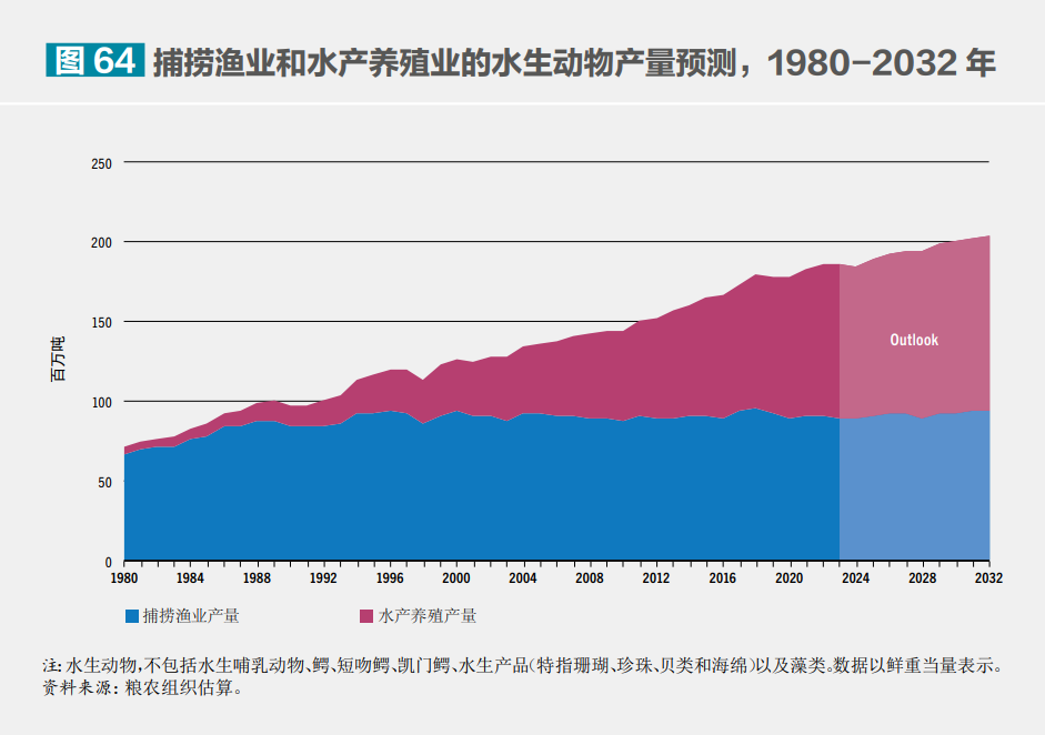 捕撈漁業(yè)和水產(chǎn)養(yǎng)殖業(yè)的水生動物產(chǎn)量預測,1980-2032年。?糧農(nóng)組織