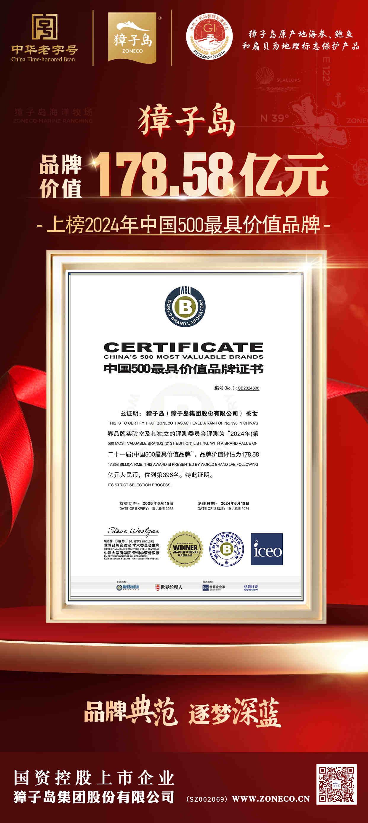 Lab)主辦的(第二十一屆)“世界品牌大會”在北京隆重舉行,會上發(fā)布了2024《中國500最具價值品牌》分析報(bào)告。在這份基于財(cái)務(wù)數(shù)據(jù)、品牌強(qiáng)度和消費(fèi)者行為分析的年度報(bào)告中,獐子島品牌以178.58億元的品牌價值榮登本年度《中國500最具價值品牌》榜單,排名396位,展現(xiàn)了強(qiáng)勁的品牌實(shí)力,成為中國海洋食品和海參行業(yè)第一價值品牌。獐子島集團(tuán)股份有限公司總裁戰(zhàn)成敏應(yīng)邀出席大會,副總裁劉明代表公司上臺領(lǐng)獎。