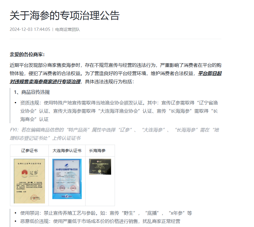 12月3日下午5點(diǎn)左右,抖音官方發(fā)布的《關(guān)于海參的專項(xiàng)治理公告》(以下簡(jiǎn)稱 “公告”)宛如一顆 “網(wǎng)絡(luò)核彈”,在網(wǎng)絡(luò)平臺(tái)銷售海參的商家群體中迅速發(fā)酵傳播,引發(fā)軒然大波。