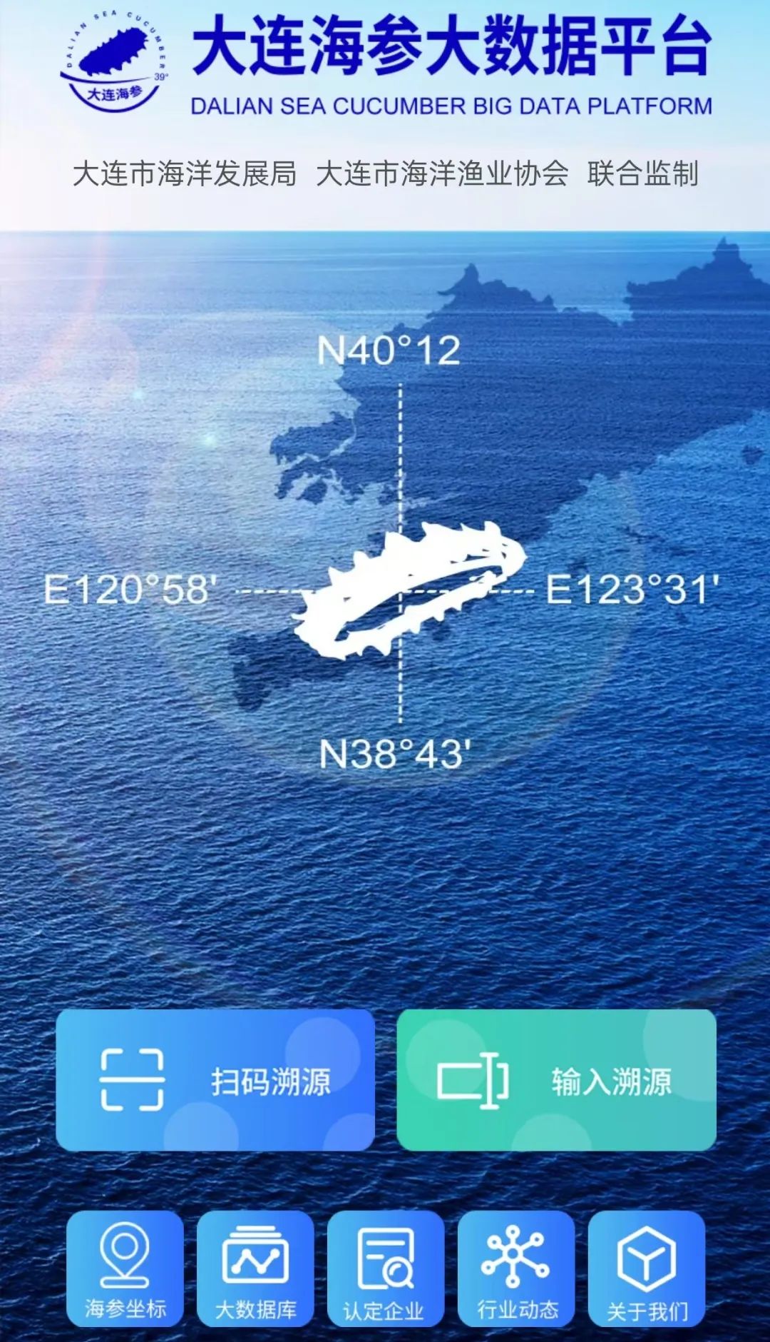 該系統(tǒng)首次將大連海參生長(zhǎng)區(qū)域(東經(jīng)120°58′至123°31′和北緯38°43′至40°12′)劃分出大連海參原產(chǎn)地九大主產(chǎn)區(qū),通過(guò)坐標(biāo)圖向社會(huì)各界清晰明示了大連海參的產(chǎn)區(qū)坐標(biāo),為消費(fèi)者提供了明確的產(chǎn)地辨識(shí)依據(jù)。今年9 月,首批 22 家企業(yè)成功獲得“大連海參原產(chǎn)地認(rèn)定企業(yè)”,“第二批、第三批的企業(yè)認(rèn)定還在進(jìn)行中”。