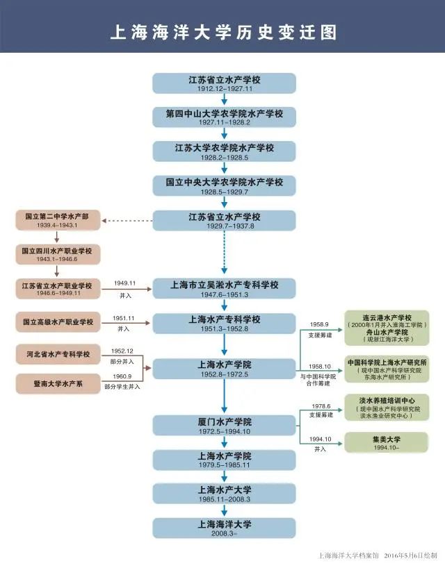 學校前身是張謇、黃炎培創(chuàng)建于1912年江蘇省立水產學校。歷經(jīng)國立中央大學農學院水產學校、上海市立吳淞水產??茖W校、上海水產??茖W校等校名。1952年升格為中國第一所本科水產高校——上海水產學院。1972年南遷廈門集美,更名為廈門水產學院。1979年遷回上海,恢復上海水產學院,保留廈門水產學院。1985年更名為上海水產大學。2008年更名為上海海洋大學。