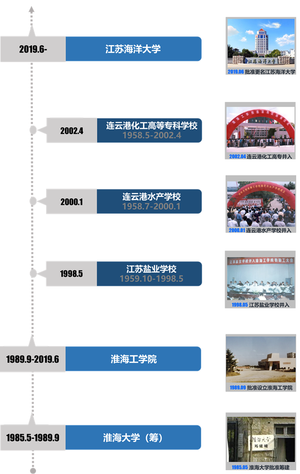 學校前身是1985年創(chuàng)辦的淮海大學(籌,1989年教育部批復為淮海工學院。1998年至2002年,均具有40年以上辦學歷史的原江蘇鹽業(yè)學校、連云港水產學校和連云港化工高等??茖W校先后并入淮海工學院。2019年6月,教育部批準學校更名為江蘇海洋大學。海洋高等教育辦學歷史可追溯至始建于1958年的新海連水產專科學校(后更名為連云港水產學校)。