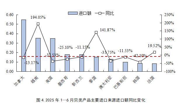 貝類進(jìn)口來(lái)源比較集中。2025年上半年,貝類前十大進(jìn)口來(lái)源國(guó)依次為加拿大、越南、美國(guó)、墨西哥、新西蘭、泰國(guó)、澳大利亞、巴基斯坦、韓國(guó)與法國(guó),合計(jì)占總進(jìn)口額的90.4%(見(jiàn)圖3)。其中,加拿大繼續(xù)位居我國(guó)最大進(jìn)口來(lái)源國(guó),盡管其出口額同比略有下降,但市場(chǎng)份額依舊領(lǐng)先。越南和泰國(guó)進(jìn)口增幅顯著,分別增長(zhǎng)194.1%和141.9%,顯示出其在中低價(jià)產(chǎn)品供應(yīng)方面的競(jìng)爭(zhēng)優(yōu)勢(shì)。法國(guó)同比增長(zhǎng)19.5%,其余主要來(lái)源國(guó)進(jìn)口額均呈不同程度下滑,韓國(guó)降幅最大,為42.1%,其次為美國(guó),同比下降37.5%,占進(jìn)口下降額的近80%,是我國(guó)貝類進(jìn)口總額下降的最主要原因(見(jiàn)圖4)。