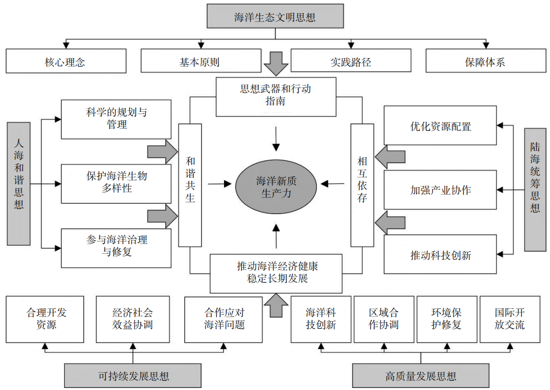 海洋生態(tài)文明思想,作為人類對海洋環(huán)境及其生態(tài)系統(tǒng)的新認識,強調人與自然和諧共生的理念,核心理念為尊重自然、順應自然、保護自然。海洋生態(tài)文明思想不僅指導著海洋資源的合理利用和保護,還推動著海洋經濟的綠色轉型,影響海洋新質生產力的形成。