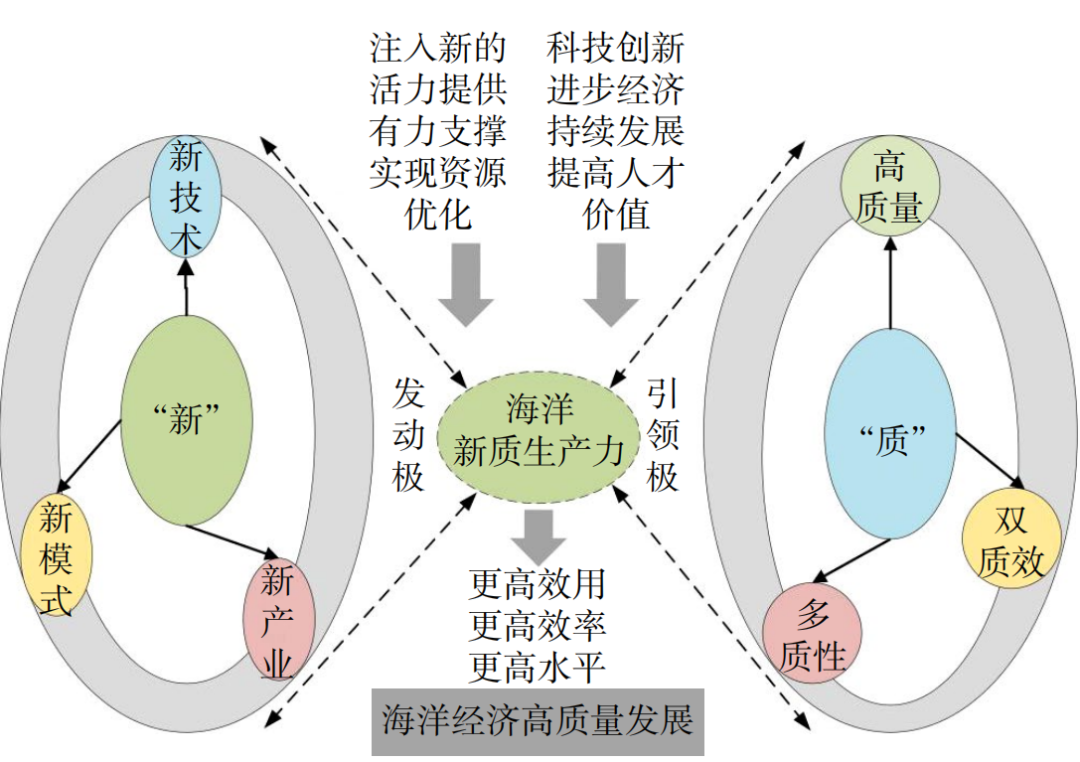 海洋新質生產力,新是其發(fā)展的原動力“發(fā)動極”,不斷推動生產力的解放與發(fā)展,并為其注入新的活力。同時,質是其引領的方向“引領極”,通過不斷拓展人類效用的邊界和豐富社會福利的內涵,降低對海洋環(huán)境的壓力,實現海洋經濟的可持續(xù)發(fā)展,促進生產力體系向更高質量、更高效率和更高水平邁進(圖7)。
