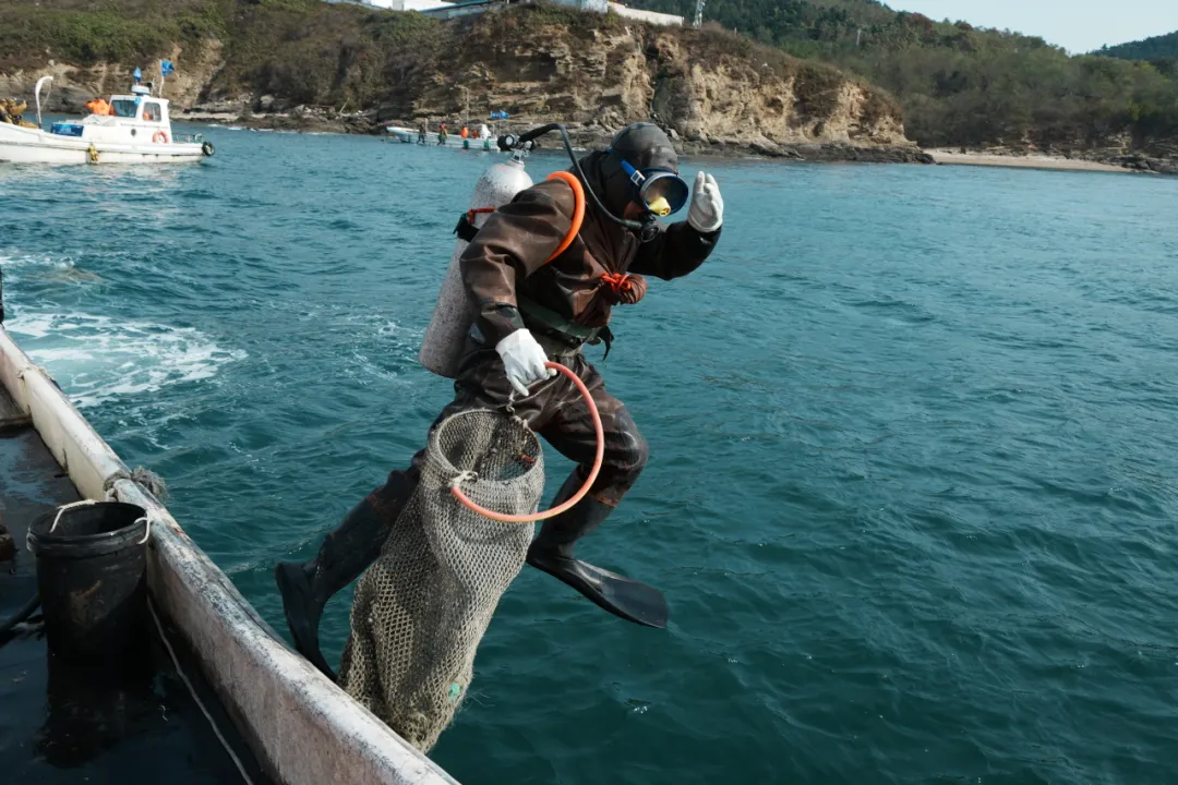 冬捕節(jié)當(dāng)天,20余名潛水員莊嚴(yán)宣誓:“感恩生態(tài),限量采捕”,鏗鏘誓言彰顯了獐子島人對海洋的敬畏與感恩。伴隨著悠揚(yáng)的冬捕節(jié)主題曲《采參謠》,現(xiàn)場氣球冉冉升起、彩煙飛揚(yáng)、采捕船齊聲鳴笛,全副武裝的潛水員們分乘捕撈船劈波斬浪,奔赴獐子島馬牙灘海域——這一聞名遐邇的純種野生源刺參原生態(tài)棲息地。