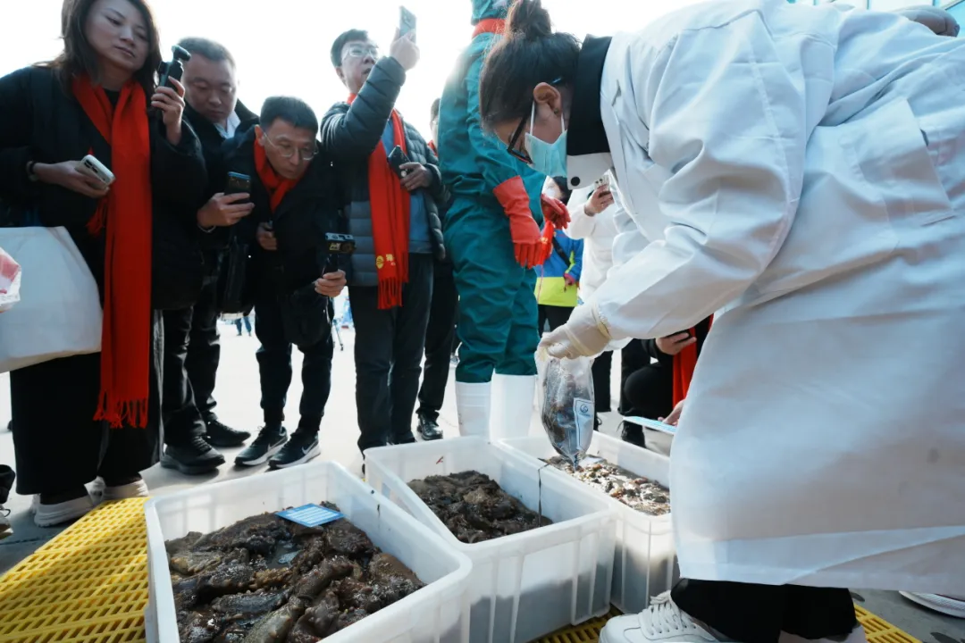 馬牙灘海域位于獐子島西北側(cè),是大連地區(qū)罕有的野生源刺參核心產(chǎn)區(qū)。近50名潛水員整理裝備后傾身入海,約十分鐘后相繼浮出水面,每人手中滿載著20余斤源刺參。船上工作人員立即進(jìn)行現(xiàn)場分揀,并詳細(xì)記錄采捕時間、海域、船號、潛水員及海參數(shù)量等信息,為原產(chǎn)地二維碼追溯體系提供精準(zhǔn)數(shù)據(jù)支撐。