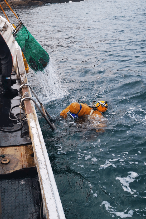 嘉賓與媒體紛紛登上船只,前往獐子島馬牙灘海域,親眼見證20余名潛水員從10艘玻璃鋼采捕船上魚躍入海,進(jìn)行海參采捕。