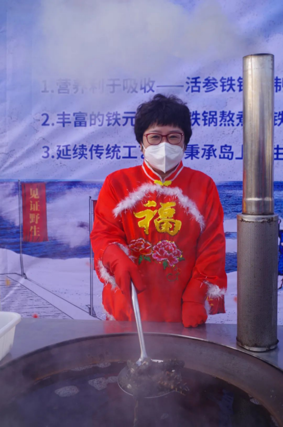 海上收獲著豐收的喜悅,陸地?zé)釟怛v騰的大鐵鍋煮海參吸引著圍觀者躍躍欲試,爭相品鑒冬捕的獐子島原產(chǎn)地第一鍋海參。