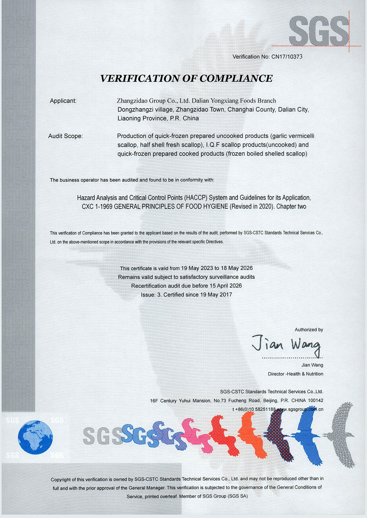 Zoneco Group Co.,LTD Dalian Yongxiang Branch located in Zhangzidao island, which is the southernmost island in Changhai County, Dalian, Liaoning. The company was founded in 1980, with a total construction area of over 223.26 million square meters. It can achieve an annual processing capacity of over 29000 tons of shellfish raw materials and a refrigeration capacity over 1500 tons. The company has obtained various certifications such as HACCP, ISO 90001, BRC, organic product certification, SGS SCM MARK, and export qualifications. It is a processing and production base of shellfish and sea cucumber.The raw materials produced by the company are all sourced from the national A-class production marine aquaculture areas. The products are mainly exported to countries and regions such as the United States, Canada, Australia, New Zealand, Japan, South Korea, Hong Kong, etc.SCALLOP
